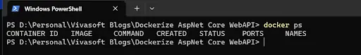 Before starting let’s check if any container is running in our docker by using the docker ps command. You can see in the image below that no container is running.